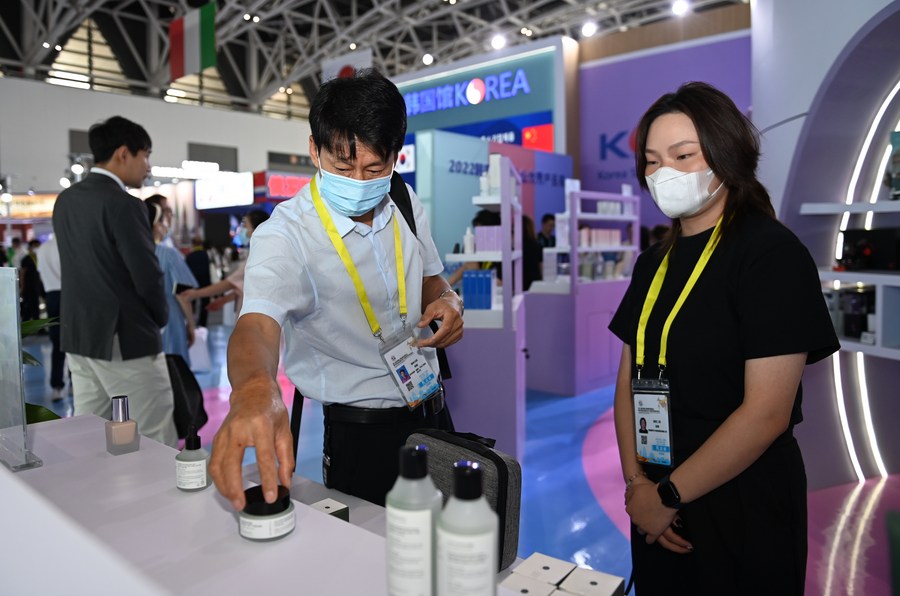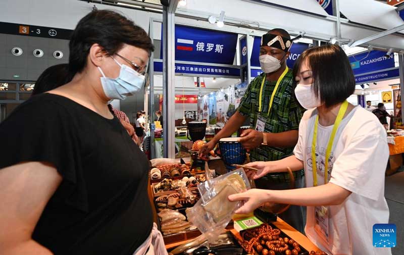 Visitors learn about specialties exhibited at the Ghana booth during the sixth Silk Road International Exposition in Xi'an, northwest China's Shaanxi Province, Aug. 14, 2022.…