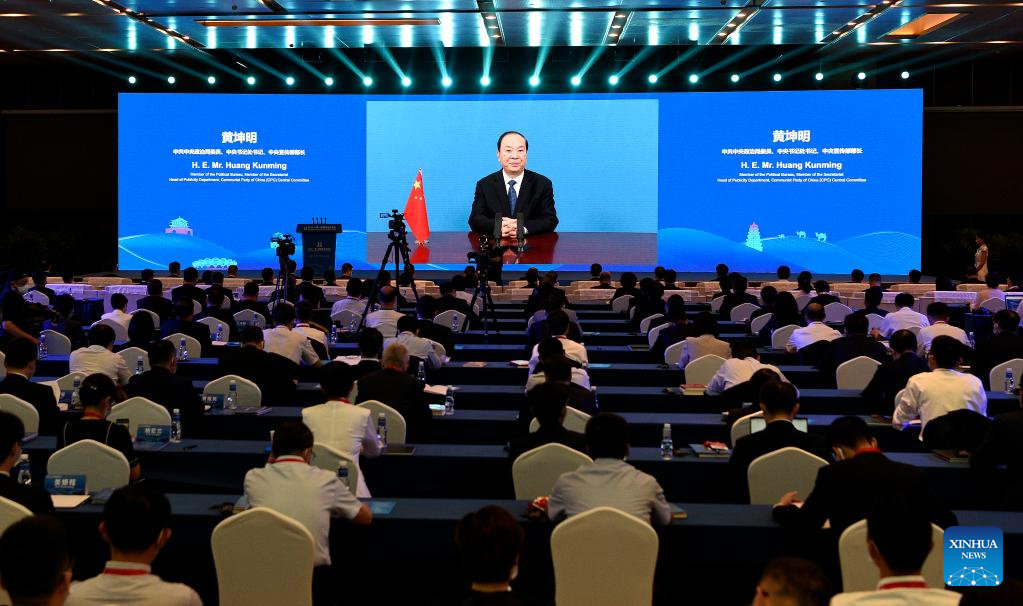 Huang Kunming, a member of the Political Bureau of the Communist Party of China (CPC) Central Committee and head of the Publicity Department of the CPC Central Committee, addresses the 2022 Media Cooperation Forum on Belt and Road via video, Aug. 9, 2022.…