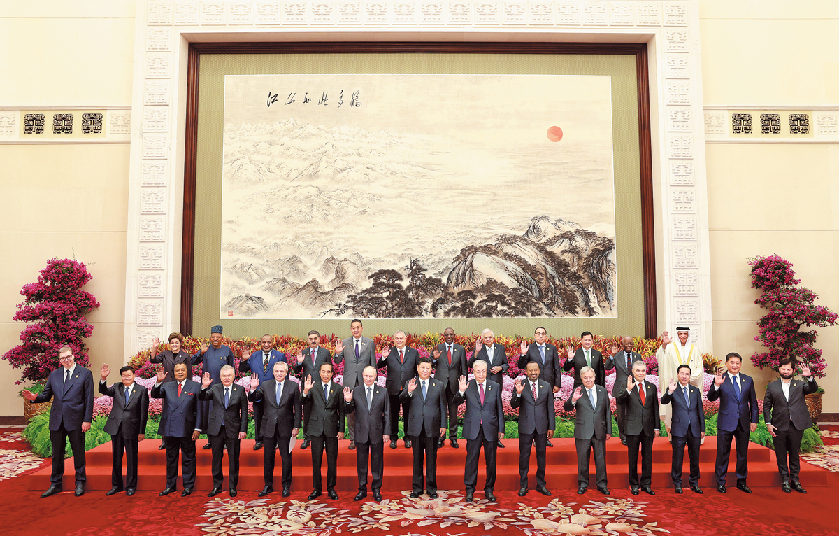 President Xi Jinping (center) and other leaders attending the third Belt and Road Forum for International Cooperation pose for a group photo before the forum's opening ceremony at the Great Hall of the People in Beijing on Wednesday. FENG YONGBIN/CHINA DAILY