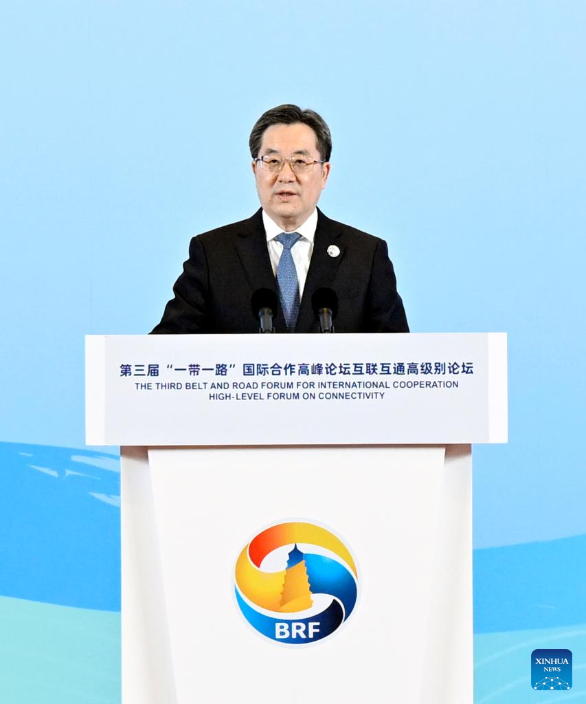 Chinese Vice Premier Ding Xuexiang, also a member of the Standing Committee of the Political Bureau of the Communist Party of China Central Committee, attends and delivers a speech at the High-level Forum on Connectivity of the Third Belt and Road Forum for International Cooperation (BRF) in Beijing, capital of China, Oct. 18, 2023.…