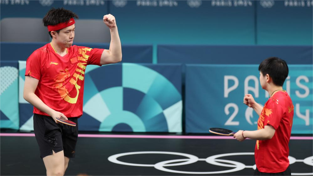 Gold medalists Feng Panfeng (R)/Zhou Ying of China pose during the awarding ceremony for the Para Table Tennis Mixed Doubles XD7 event at the Paris 2024 Paralympic Games in Paris, France, Sept. 1, 2024.…
