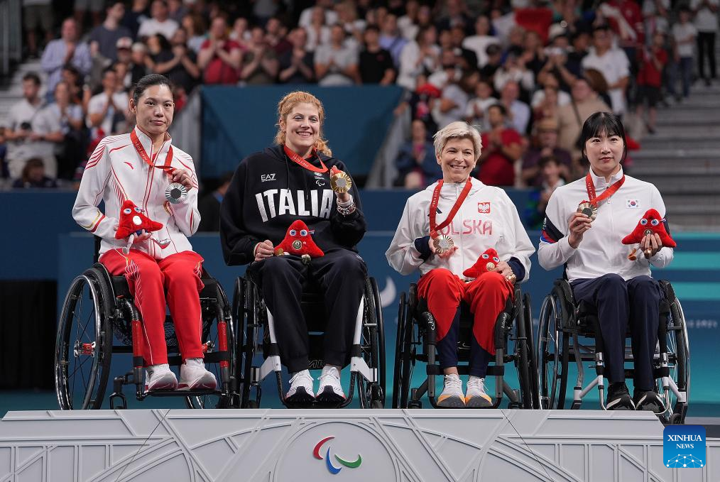 (L to R) Silver medalist Liu Jing of China, gold medalist Giada Rossi of Italy and bronze medalists Dorota Buclaw of Poland and Seo Su Yeon of South Korea pose during the awarding ceremony for the Para Table Tennis women's singles WS1-2 event at the Paris 2024 Paralympic Games in Paris, France, Sept. 6, 2024.…