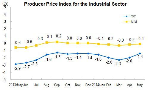 The Producer Price Index (PPI) for manufactured goods dropped 0.1 percent month-on-month, and contracted 1.4 percent year on year - the 27th consecutive month of decline. However, the rate of decline narrowed from April's two percent to a five-month low.