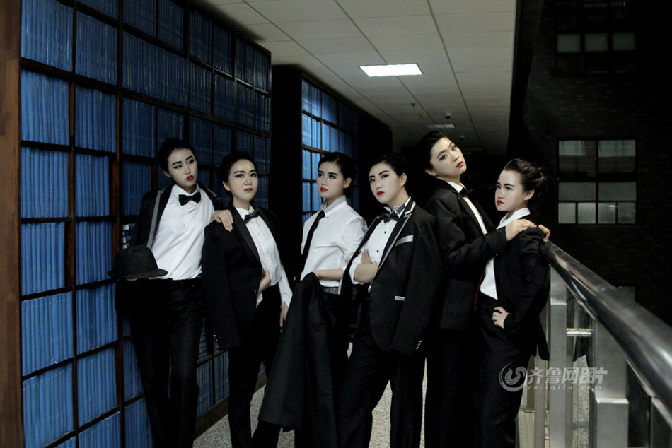 Girls of Law School of Shandong University in east China’s Shandong province take a group of unisex style graduation photos themed with “l(fā)egal beauties”. (Photo source: iqilu.com)