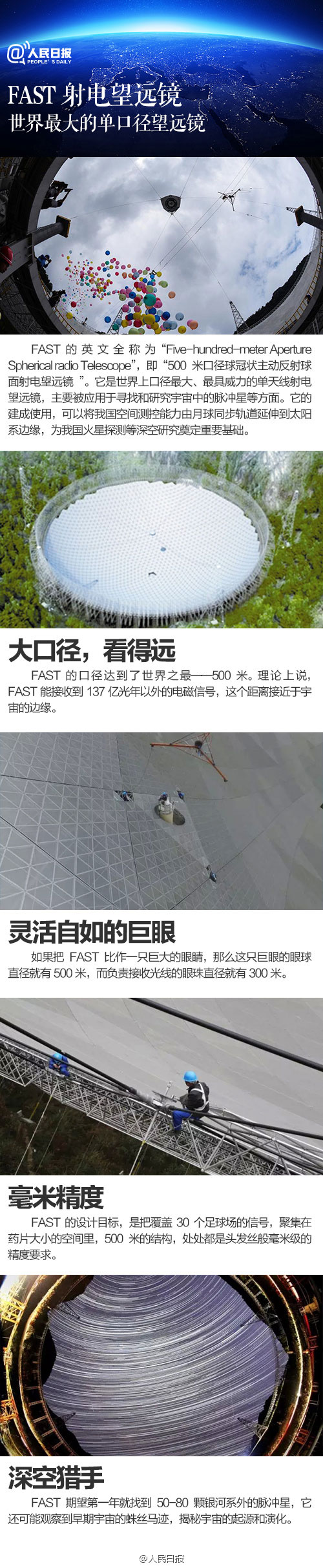 With an investment of 1.2 billion yuan ($182 million), China's largest ever astronautics project began in March 2011 and will be completed in September of this year. Once complete, the "Five-hundred-meter Aperture Spherical radio Telescope," or FAST, will surpass the capability of Puerto Rico's Arecibo Observatory, which is 305 meters in diameter.(Photo/Weibo of People's Daily)