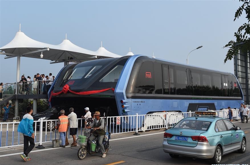 Photos of the futuristic transit elevated bus TEB-1 conducting road test in north China's Qinhuangdao on August 2 have gone viral. The 22-meter-long, 7.8-meter-wide and 4.8-meter-high TEB-1 can carry up to 300 passengers, media reports say.