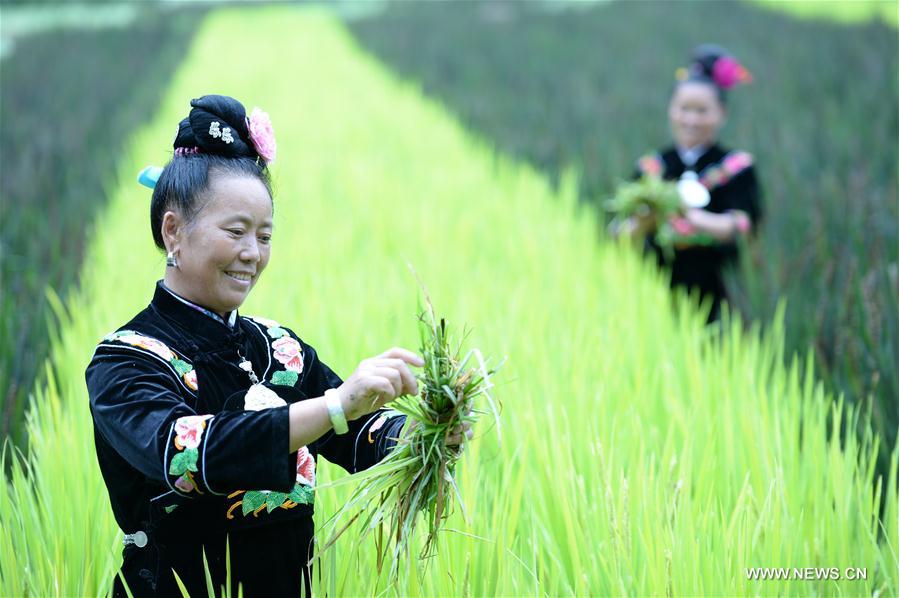 Farmers of Miao ethnic group work in paddy-fields in Yangfang Village of Taijiang County, southwest China's Guizhou Province, Aug. 24, 2017. (Xinhua/Yang Ying)