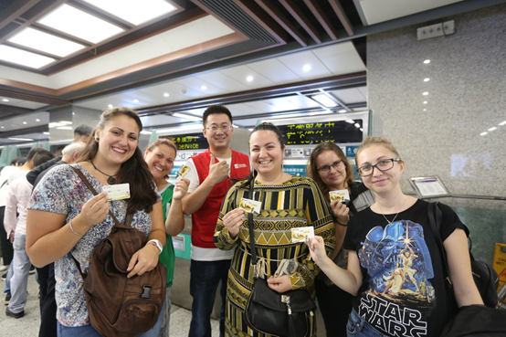 Five Ukrainian tourists posed for a picture at the Bell Tower station of Xi’an Metro. They purchased tickets to the Giant Wild Goose Pagoda under the guidance of a volunteer named Luo Xin, Sep. 30, 2018. (Photo: Zhang Pengbin, Shen Li/ People’s Daily)?