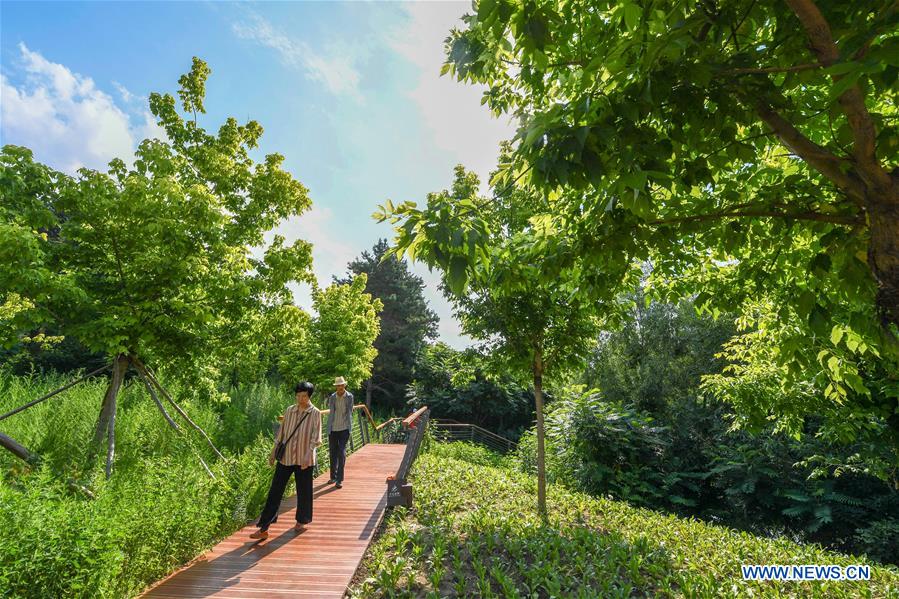 Citizens walk at the Changchun Culture of Water Ecology Park in Changchun, capital of northeast China's Jilin Province, July 9, 2019. Built in 1932 as Changchun Water Treatment Plant, the park opened to the public on Sept. 30, 2018 after a total renovation providing a good place for local citizens to spend summer days. (Xinhua/Zhang Nan)