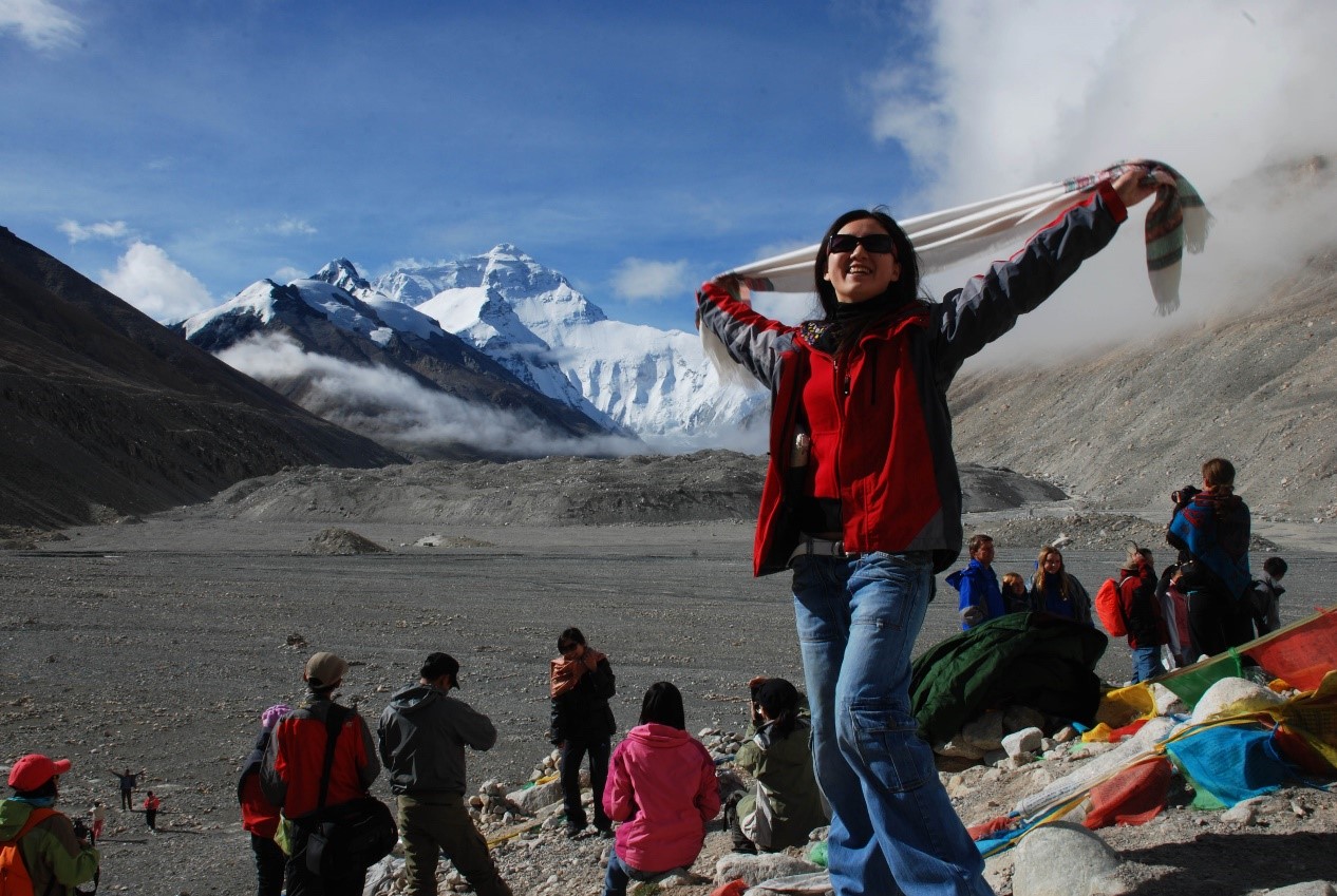 A tourist pose for a picture at the Mount Qomolangma base camp. Photo by Dong Naide, People’s Daily Online