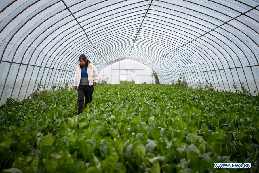 Feng Yahong checks the growth of vegetables at a greenhouse in Xiji County, northwest China's Ningxia Hui Autonomous Region, Oct. 29, 2020. Xihaigu, one of China's most impoverished areas located in Ningxia, saw its last impoverished county removed from the national poverty list on Nov. 16, 2020. The victory is another landmark in China's campaign to eradicate absolute poverty, during which "she power" played an indispensable role. Feng Yahong, a 33-year-old rural woman living in the areas, has helped many local women get rid of poverty through leading them in planting vegetables. She used to be a vegetable peddler. For pursuing a better life, in 2009, she tried to rent some greenhouses to start her vegetable planting business. In Xihaigu, most men worked away from home to earn money to support families but women were left behind to take care of family members. Feng hired many local rural women as vegetable growers. In 2012, they jointly started a vegetable planting cooperative. At the beginning of the business, Feng suffered lots of setbacks, such as a failure of producing qualified vegetables and a fire in the greenhouses. Those failures nearly led her into despair because she had used up all her money and even couldn't pay the workers she hired. However, so as not to disappoint people who trusted in her, Feng pulled herself up soon and kept trying all kinds of ways to raise money for paying off debts. Fortunately, she managed to get a loan from the local Women's Federation so that she could restart her vegetable business. Learning from previous failures, Feng gradually made her business on a right track. Now, during busy farming seasons, there are over 300 employees working in her cooperative. As Feng's business grows, the wages of those women worker have dramatically increased, and the members of the cooperative can also get a bonus every year. (Xinhua/Yang Zhisen)