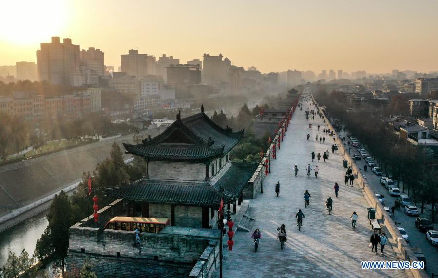 Aerial photo taken on Jan. 1, 2021 shows people visiting the ancient city wall at sunset in Xi'an, northwest China's Shaanxi Province. (Xinhua/Tao Ming)