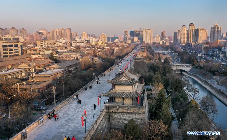 Aerial photo taken on Jan. 1, 2021 shows people visiting the ancient city wall at sunset in Xi'an, northwest China's Shaanxi Province. (Xinhua/Tao Ming)