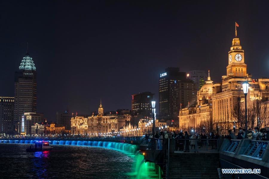 People enjoy the light show at the Bund in east China's Shanghai, Jan. 2, 2021. (Xinhua/Wang Xiang)