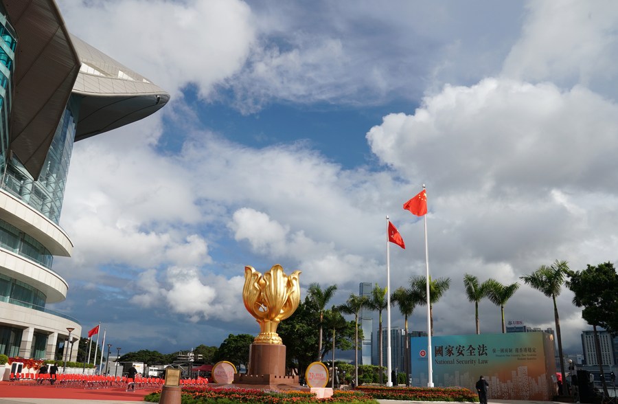 Photo taken on July 1, 2020 shows the Golden Bauhinia Square in Hong Kong, south China. (Xinhua/Li Gang)