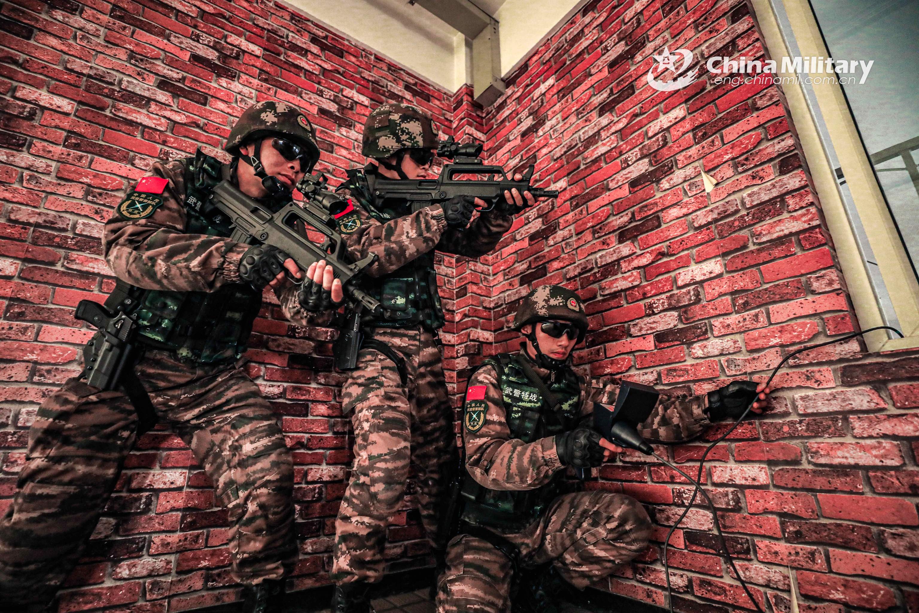 Special operations soldiers assigned to a detachment under the Chinese People’s Armed Police (PAP) Force Tianjin Contingent advance and reconnoiter with aimed rifles in assault group during the comprehensive counter-hijacking training on March 4, 2021. (eng.chinamil.com.cn/Photo by Qian Zhiqiang)