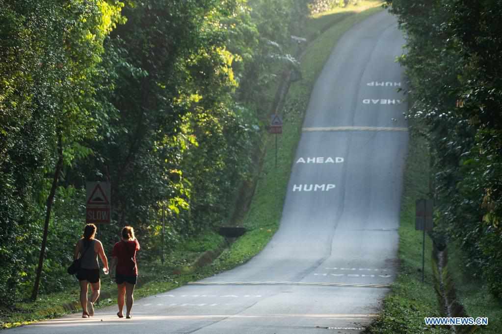 People walk on a road in the forest of Singapore's Central Catchment Nature Reserve on April 21, 2021. (Photo by Then Chih Wey/Xinhua)