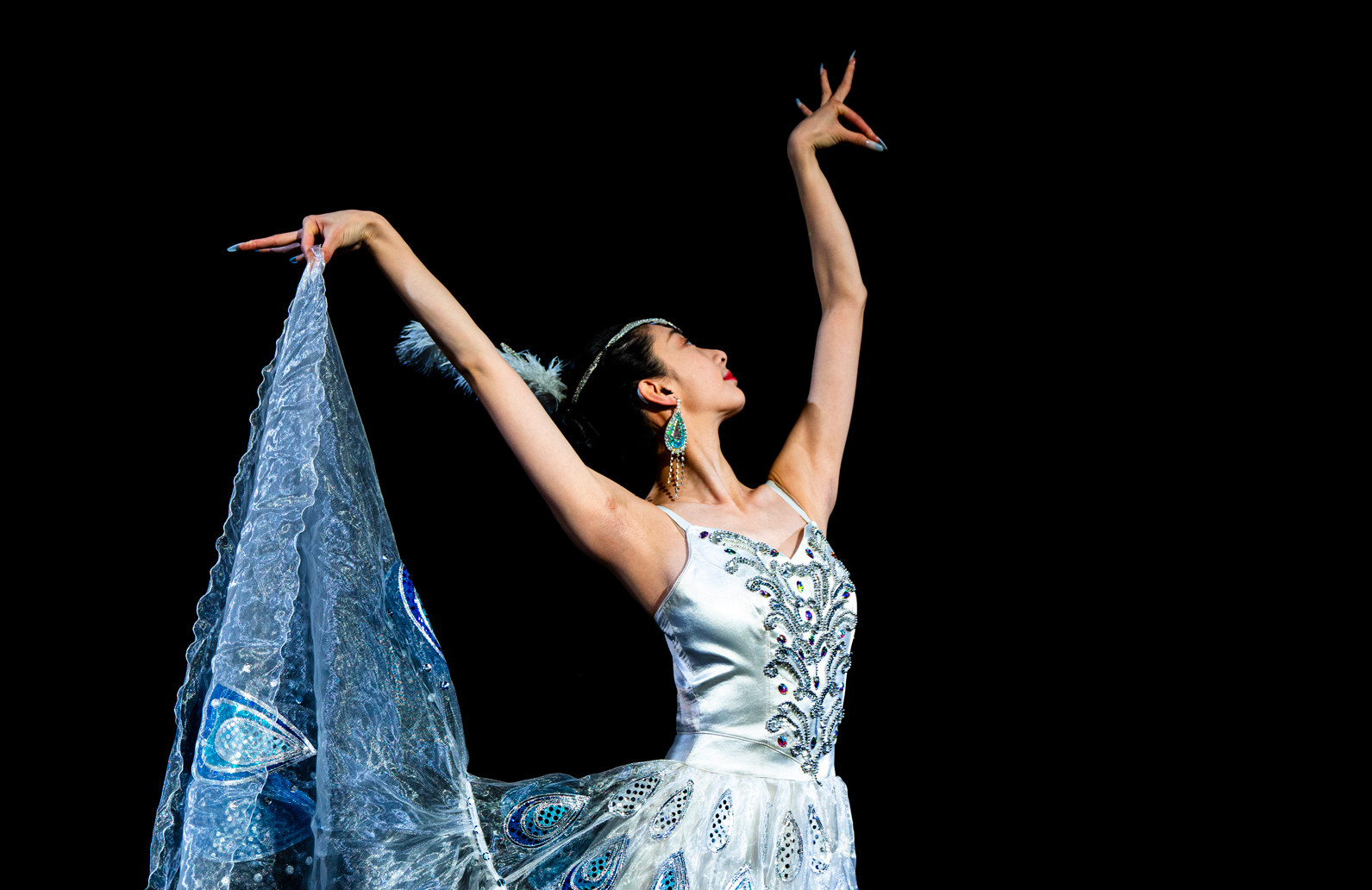 As the bright birds' chirping breaks the silence, a light is cast onto the center of the stage, illuminating the silhouette of a dancer. At closer appearance, she is wearing a gossamer dress and adorned with peacock-like feathers pinned into her hair. In tune with the ethereal music, she kneels, spins, and waves her arms about into the air. At the show's final climax, she leaps into the air as if possessed by the spirit of a peacock.