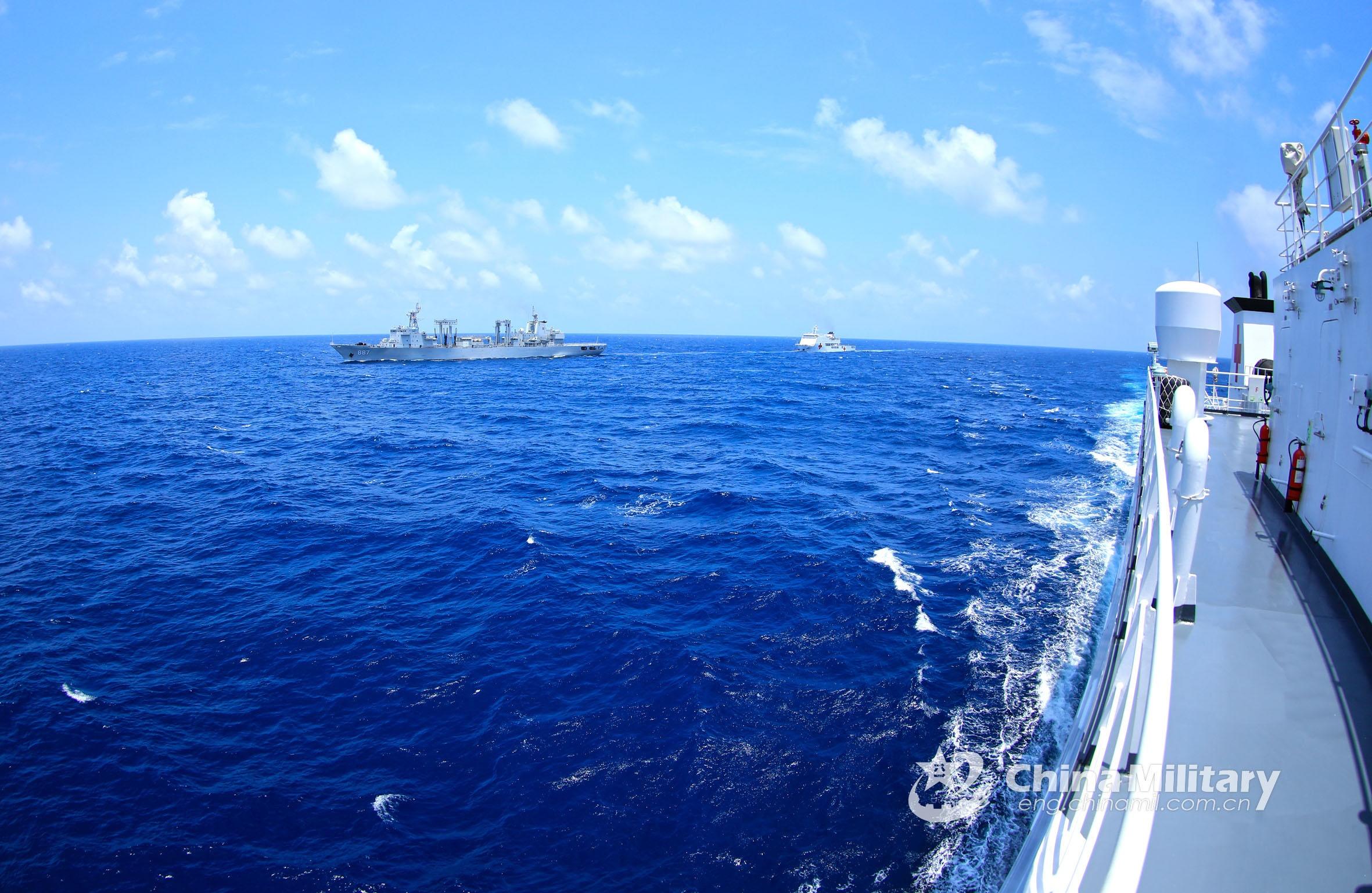 Vessels attached to a naval base under the PLA Southern Theater Command perform underway astern replenishment during a replenishment-at-sea training exercise in mid-April, 2021. (eng.chinamil.com.cn/Photo by Xue Chengqing)