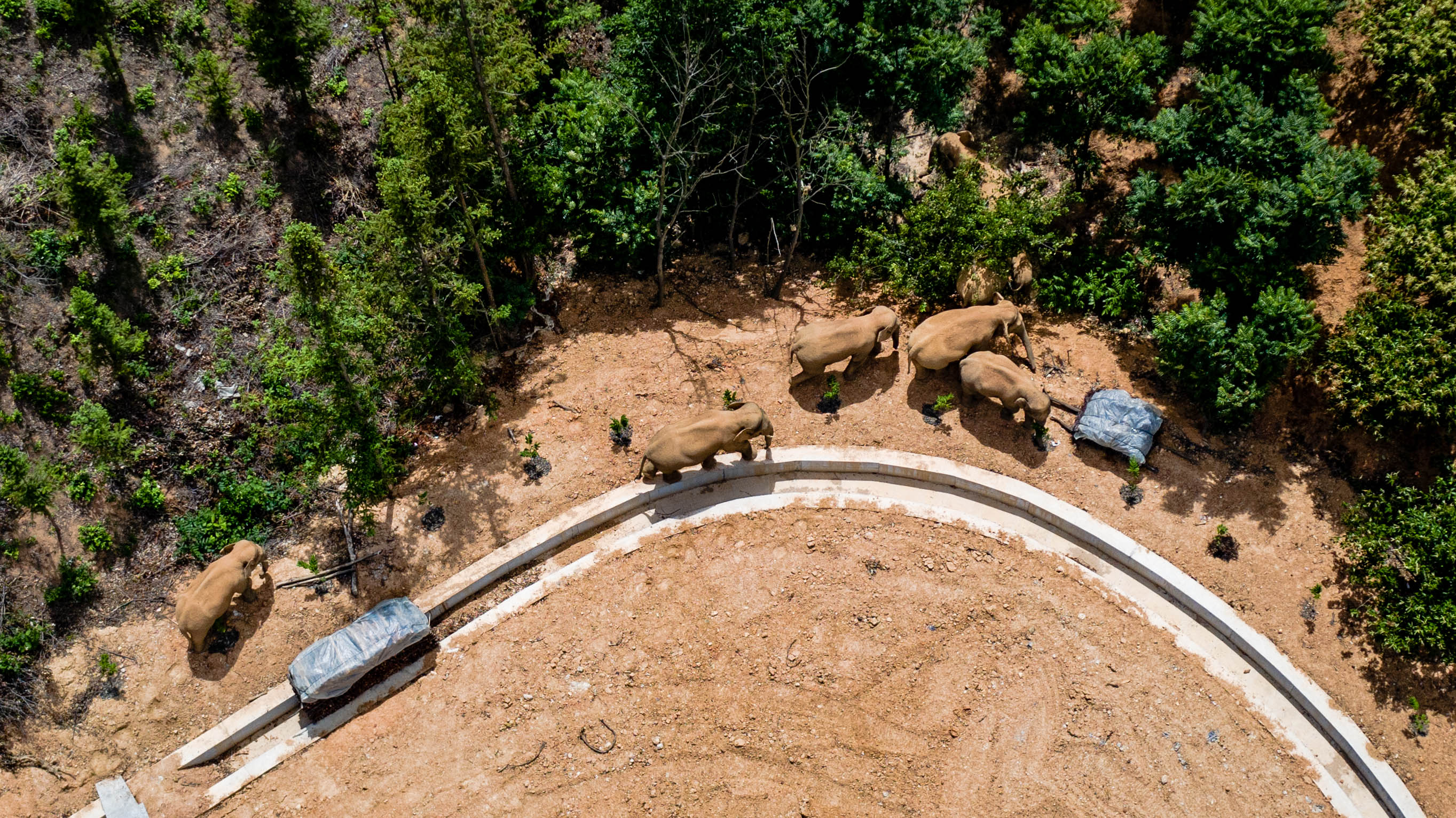 Aerial photo taken on May 28, 2021, shows the herd of wandering wild Asian elephants in Eshan County, Yuxi City, southwest China's Yunnan Province. (Xinhua/Hu Chao)