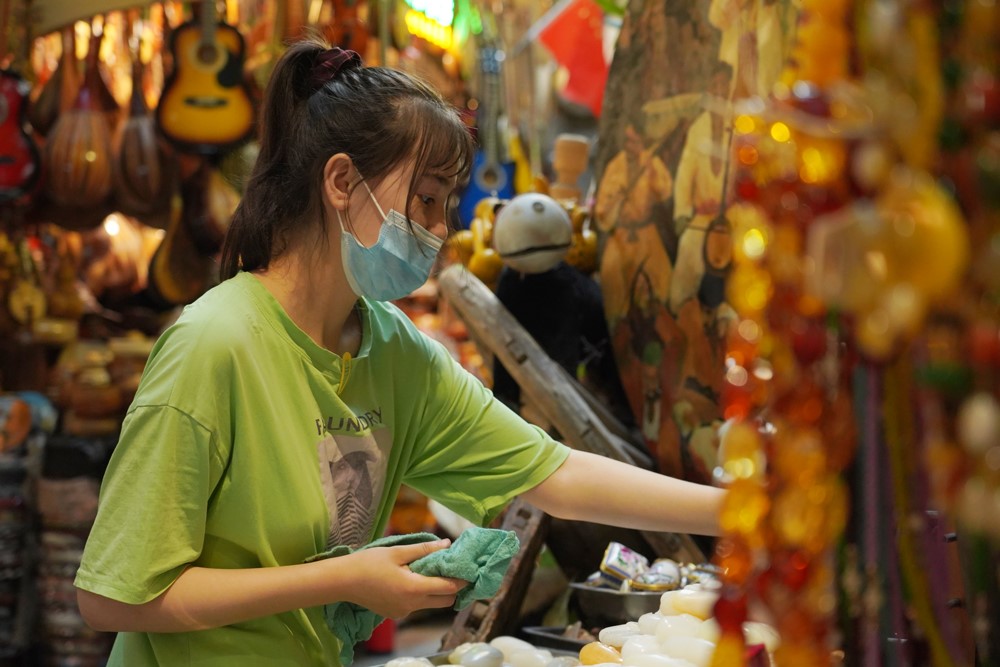 A shop owner polishes some of her wares while waiting for customers at the Xinjiang International Grand Bazaar in Urumqi, northwest China's Xinjiang Uygur Autonomous Region, May 30, 2021. (People's Daily Online/Zhang Ruohan)