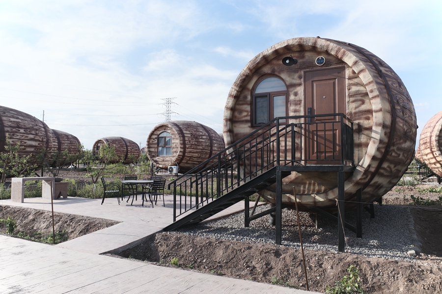 At the Huoshanhong winery’s holiday resort in Turpan, 192 barrel-shaped oaken huts are now open to the public, with a unique painting of Turpan’s nature and historical sites in each room. (People's Daily Online/Kou Jie)