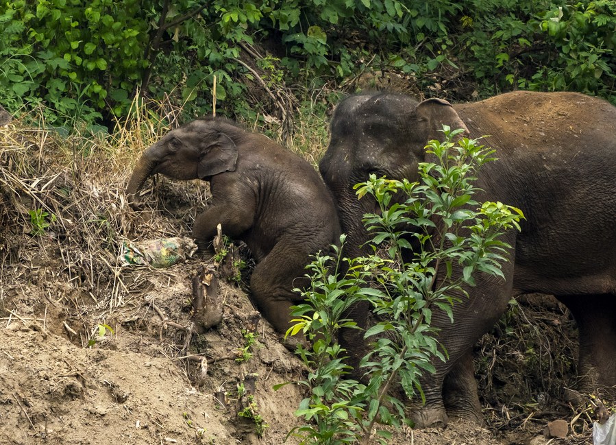 A wild Asian elephant helps baby elephant climb a slope in Yuanjiang County of Yuxi City, southwest China's Yunnan Province, Aug. 9, 2021. (Xinhua/Jiang Wenyao)