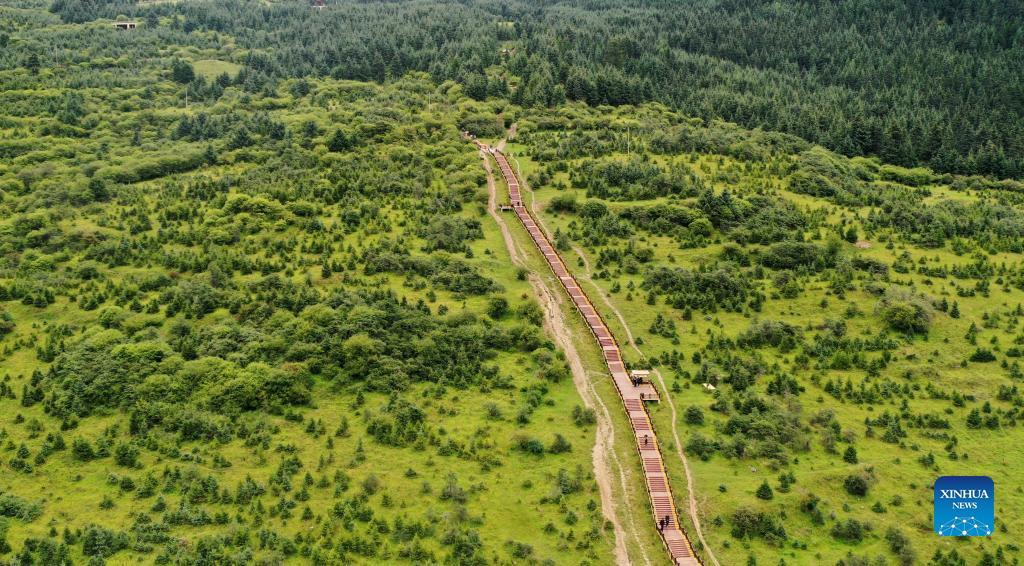 Aerial photo taken on Aug. 28, 2021 shows tourists walking on a wooden walkway at Zhagana scenic area in Diebu County of Gannan Tibetan Autonomous Prefecture, northwest China's Gansu Province. (Xinhua/Du Zheyu)