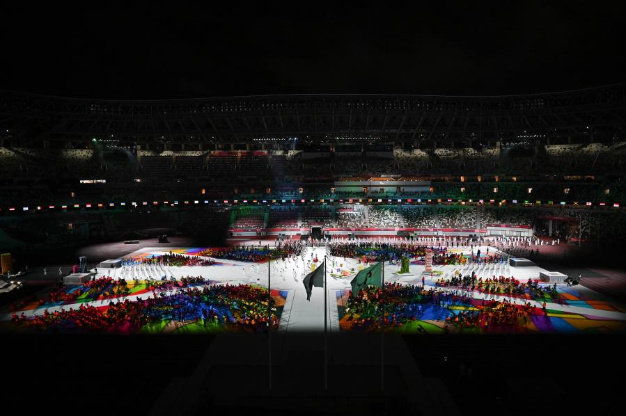 Flagbearers enter the Olympic Stadium during the closing ceremony of the Tokyo 2020 Paralympic Games in Tokyo, Japan, Sept. 5, 2021. (Xinhua/Zhu Wei)