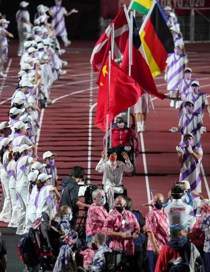Zhang Xuemei, who won the silver with the Chinese women's wheelchair basketball team, served as Team China's flagbearer at the ceremony.