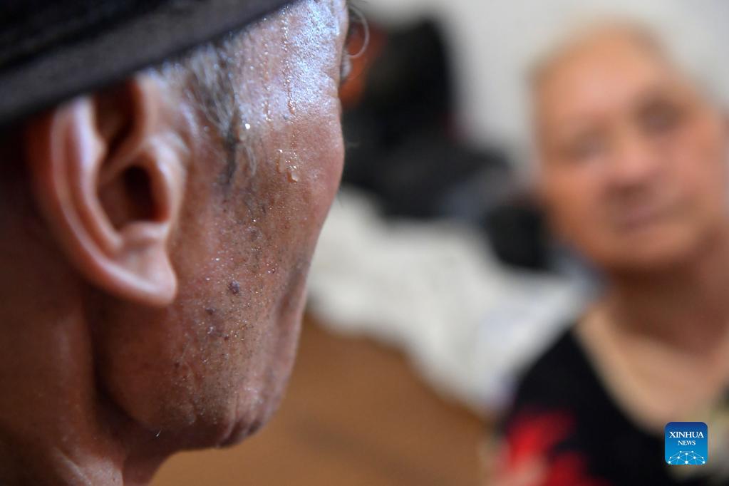 Luo Anmin'a face is covered with sweat after carrying his wife to the wheelchair at Xuluo Village of Nanchang County, east China's Jiangxi Province, Sept. 5, 2021. Luo Anmin is 76 years old. In 2008, his wife Wan Zhaolian suffered from brain cancer and unfortunately lost consciousness, but Luo never gave up. He talked to his wife and gave her massages every day, hoping she can be better off some day. After three years of loving care, the miracle happened. In 2011, Wan Zhaolian regained consciousness, which gave Luo more hope although she still couldn't talk and walk. Luo said he loves his wife so much that he will be always by her side and taking good care of her as long as she is alive. To Luo, his wife means everything, and most importantly, a home. (Xinhua/Peng Zhaozhi)