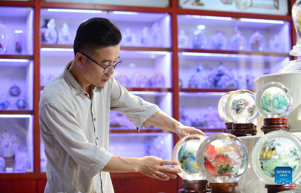 A staff member arranges inside painting works at a museum featuring inside paintings in Taocheng District of Hengshui City, north China's Hebei Province, Sept. 2, 2021. Inside painting, or inner painting, is a traditional Chinese art form. It originally involves tiny snuff bottles which have pictures and calligraphy painted on the inside surface of the bottle. Snuff bottle paintings are produced by manipulating a specialized brush through the neck of the bottle. The process of painting, which is totally reversed inside the bottle, requires absolute precision from the artist. Wang Ziyong, 52, an inside painting craftsman, studied inside painting with his father Wang Ruicheng since childhood. After graduating from college, Wang returned to Hengshui City and devoted himself to the artwork. Thanks to years of practice, he quickly developed his own style. In order to better paint the color highlights and handle details, Wang developed a new type of brush, which improved the drawing efficiency. He also developed different styles to create inside painting, not only inside snuff bottles, but also inside pencil vases, crystal balls, tea sets and folding screens. In 1995, he gave up the traditional workshop-style production mode of inside painting and established a modern enterprise, integrating development, design, production, processing and sales of the artwork. In 2003, with the help of his father, Wang founded a museum in Hebei themed on inside paintings, showing the historical development and creative process of the art. In 2006, inside painting was added to the list of national intangible cultural heritages. In 2012, Wang Ziyong was named the inheritor of provincial intangible cultural heritage projects. During all these years, Wang has won many prizes with his innovative artwork, and offered training to 38 apprentices, trying to make this traditional skill shine a new light. "I hope more people can feel the charm of Hengshui inside painting in the future," Wang said. (Xinhua/Jin Haoyuan)