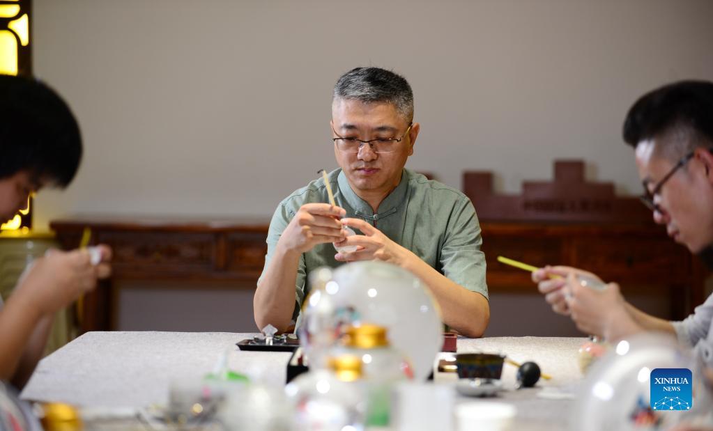 Wang Ziyong and his apprentices create inside painting works on the inside surface of snuff bottles at a museum featuring inside paintings in Taocheng District of Hengshui City, north China's Hebei Province, Sept. 1, 2021. Inside painting, or inner painting, is a traditional Chinese art form. It originally involves tiny snuff bottles which have pictures and calligraphy painted on the inside surface of the bottle. Snuff bottle paintings are produced by manipulating a specialized brush through the neck of the bottle. The process of painting, which is totally reversed inside the bottle, requires absolute precision from the artist. Wang Ziyong, 52, an inside painting craftsman, studied inside painting with his father Wang Ruicheng since childhood. After graduating from college, Wang returned to Hengshui City and devoted himself to the artwork. Thanks to years of practice, he quickly developed his own style. In order to better paint the color highlights and handle details, Wang developed a new type of brush, which improved the drawing efficiency. He also developed different styles to create inside painting, not only inside snuff bottles, but also inside pencil vases, crystal balls, tea sets and folding screens. In 1995, he gave up the traditional workshop-style production mode of inside painting and established a modern enterprise, integrating development, design, production, processing and sales of the artwork. In 2003, with the help of his father, Wang founded a museum in Hebei themed on inside paintings, showing the historical development and creative process of the art. In 2006, inside painting was added to the list of national intangible cultural heritages. In 2012, Wang Ziyong was named the inheritor of provincial intangible cultural heritage projects. During all these years, Wang has won many prizes with his innovative artwork, and offered training to 38 apprentices, trying to make this traditional skill shine a new light. "I hope more people can feel the charm of Hengshui inside painting in the future," Wang said. (Xinhua/Jin Haoyuan)