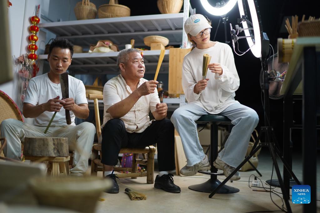 Li Nian'gen (C) and his team introduce bamboo products via livestreaming in Dongcun Township, Fenyi County, Xinyu City of east China's Jiangxi Province, Sept. 1, 2021. Li Nian'gen, 62, is the fifth-generation inheritor of bamboo-weaving techniques in Dongcun Township. Li acquired bamboo-weaving techniques from his uncle when he was barely nine years old, and started to make a living on his own at the age of 15. More than 20 of his apprentices chose to seek employment for better income in other walks of life away from home in early 1990s, but Li decided to stay and stick to his profession. Li occasionally demonstrated his bamboo-weaving techniques on a video clip platform as suggested by others in 2019, and became increasingly popular ever since then. Now Li has more than 8 million followers on different platforms, with his short videos popular among netizens. (Xinhua/Zhou Mi)