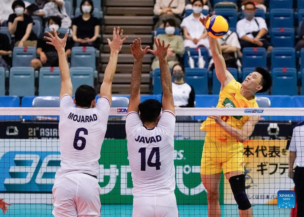 Yu Yuantai (R) of China spikes during the semi-final against Iran at the 21st Asian Senior Men's Volleyball Championship in Chiba, Japan on Sept. 18, 2021. (Photo by Christopher Jue/Xinhua)