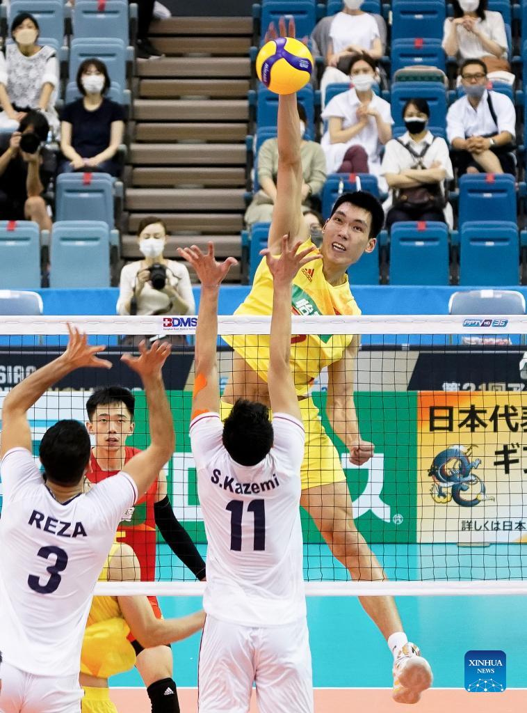 Peng Shikun (R) of China spikes during the semi-final against Iran at the 21st Asian Senior Men's Volleyball Championship in Chiba, Japan on Sept. 18, 2021. (Photo by Christopher Jue/Xinhua)