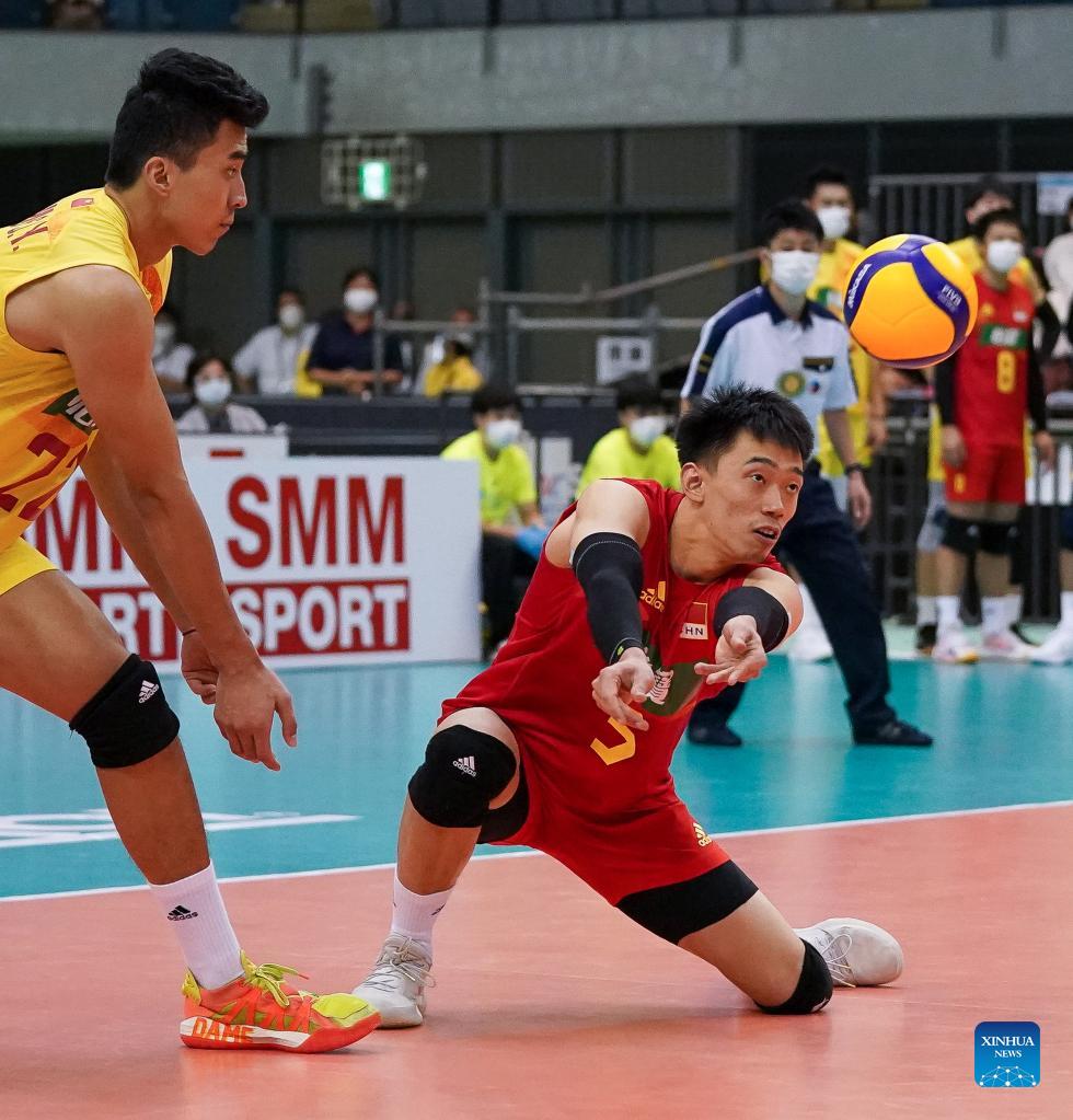 Yang Yiming (R) of China passes the ball during the semi-final against Iran at the 21st Asian Senior Men's Volleyball Championship in Chiba, Japan on Sept. 18, 2021. (Photo by Christopher Jue/Xinhua)
