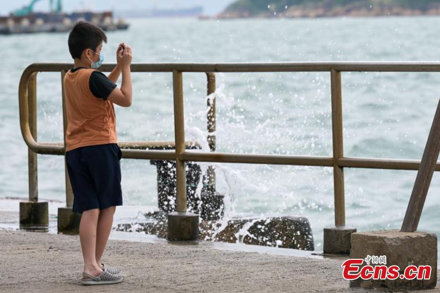 Photo shows a boy taking photos along the waterfront in Hong Kong, Oct. 12, 2021. The Hong Kong Observatory on Tuesday afternoon issued the No. 8 warning signal as Tropical Cyclone Kompasu is expected to move closest to Hong Kong. (Photo/China News Service)