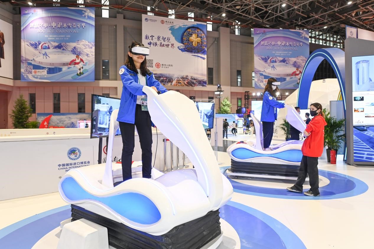 Visitors experience skiing on VR machines at the 4th China International Import Expo (CIIE) on Nov. 6, 2021, the second day of the event. (People’s Daily/ Jiang Yushi)