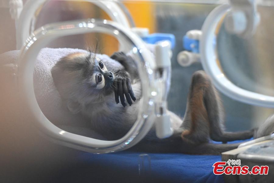 The black-shanked douc langur stays in incubators at Chimelong Safari Park in Guangzhou, Guangdong Province, Nov. 10, 2021. (Photo: China News Service/Chen Jimin)