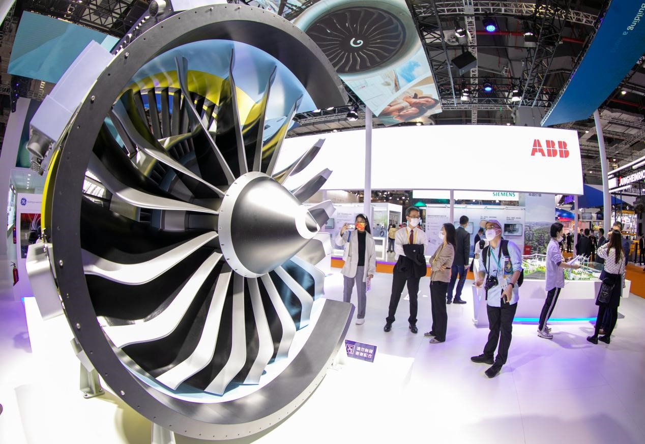 Visitors watch a LEAP aero engine exhibited by General Electric Company at the Intelligent Industry and Information Technology exhibition area of the 4th China International Import Expo (CIIE), Nov. 6, 2021. (People’s Daily Online/ Zhai Huiyong)