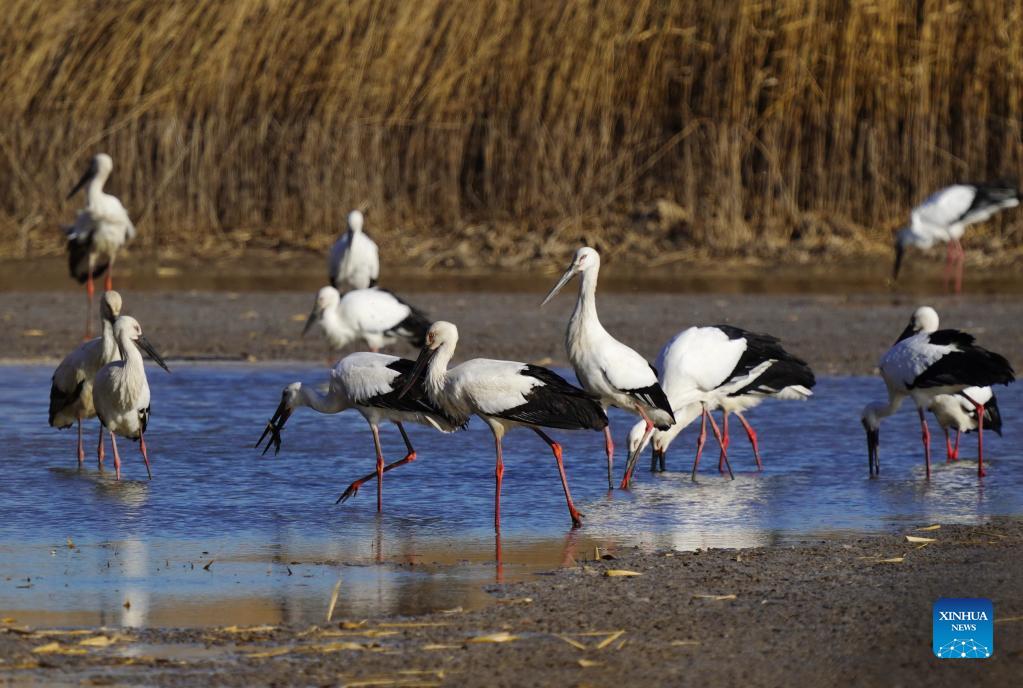 A flock of oriental white storks forage during their southward migration at Caofeidian wetland in Tangshan, north China's Hebei Province, Nov. 14, 2021. The Caofeidian wetland, located in the city of Tangshan, is an important spot for the migratory bird species which is under first-class national protection and is listed as "endangered" by the International Union for Conservation of Nature. (Xinhua/Yang Shiyao)