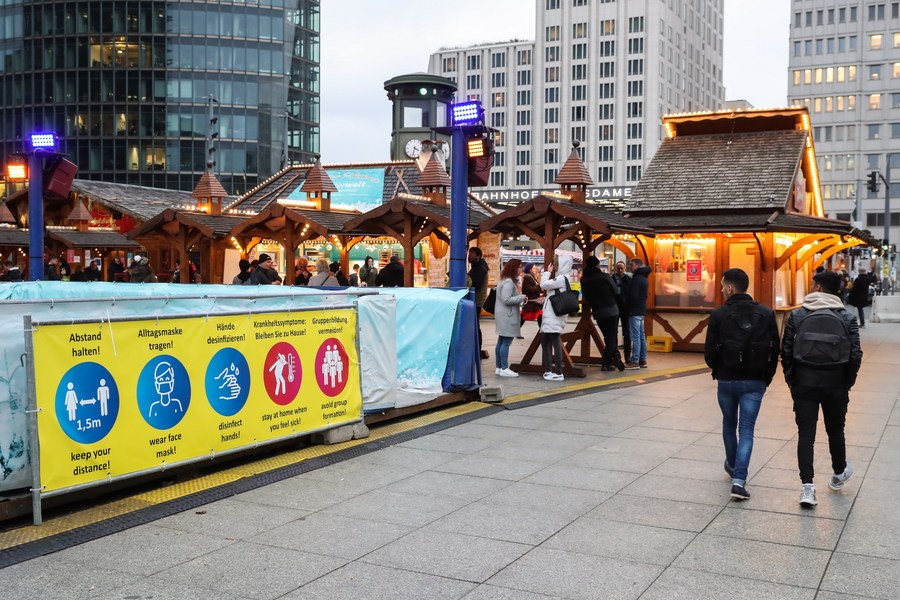 People walk past a sign to notify visitors of COVID-19 measures at a market in Berlin, Germany, on Nov. 15, 2021. (Xinhua/Shan Yuqi)