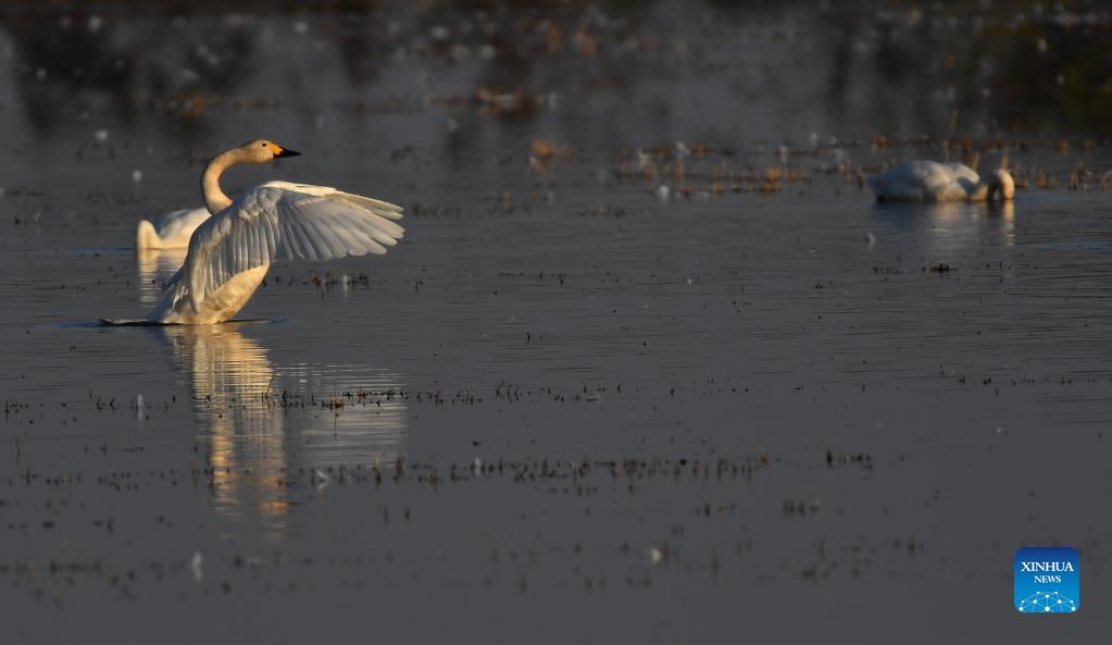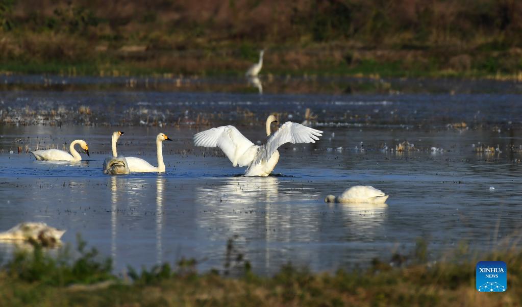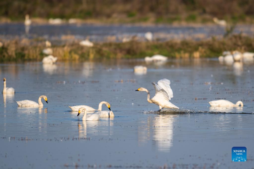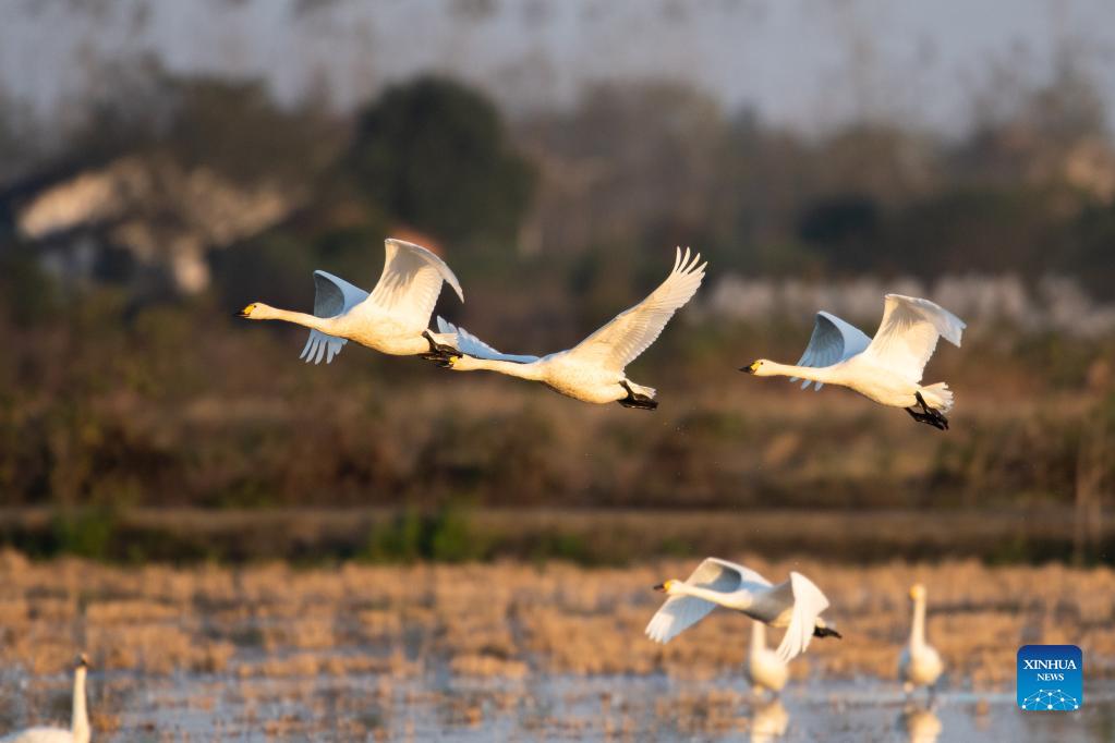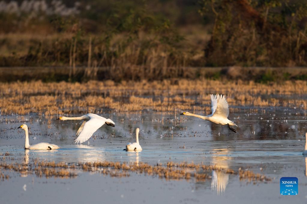 Little swans are seen at the Donggu Lake wetland of the Quyuan administration area in Yueyang City, central China's Hunan Province, Nov. 23, 2021. About 3,000 little swans have arrived at the Donggu Lake wetland of the Quyuan administration area in Yueyang for wintering. (Xinhua/Zhao Zhongzhi)