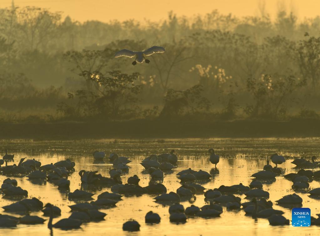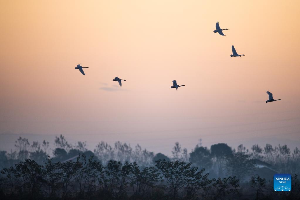 A flock of little swans fly at dawn in the Quyuan administration area in Yueyang City, central China's Hunan Province, Nov. 24, 2021. About 3,000 little swans have arrived at the Donggu Lake wetland of the Quyuan administration area in Yueyang for wintering. (Xinhua/Zhao Zhongzhi)