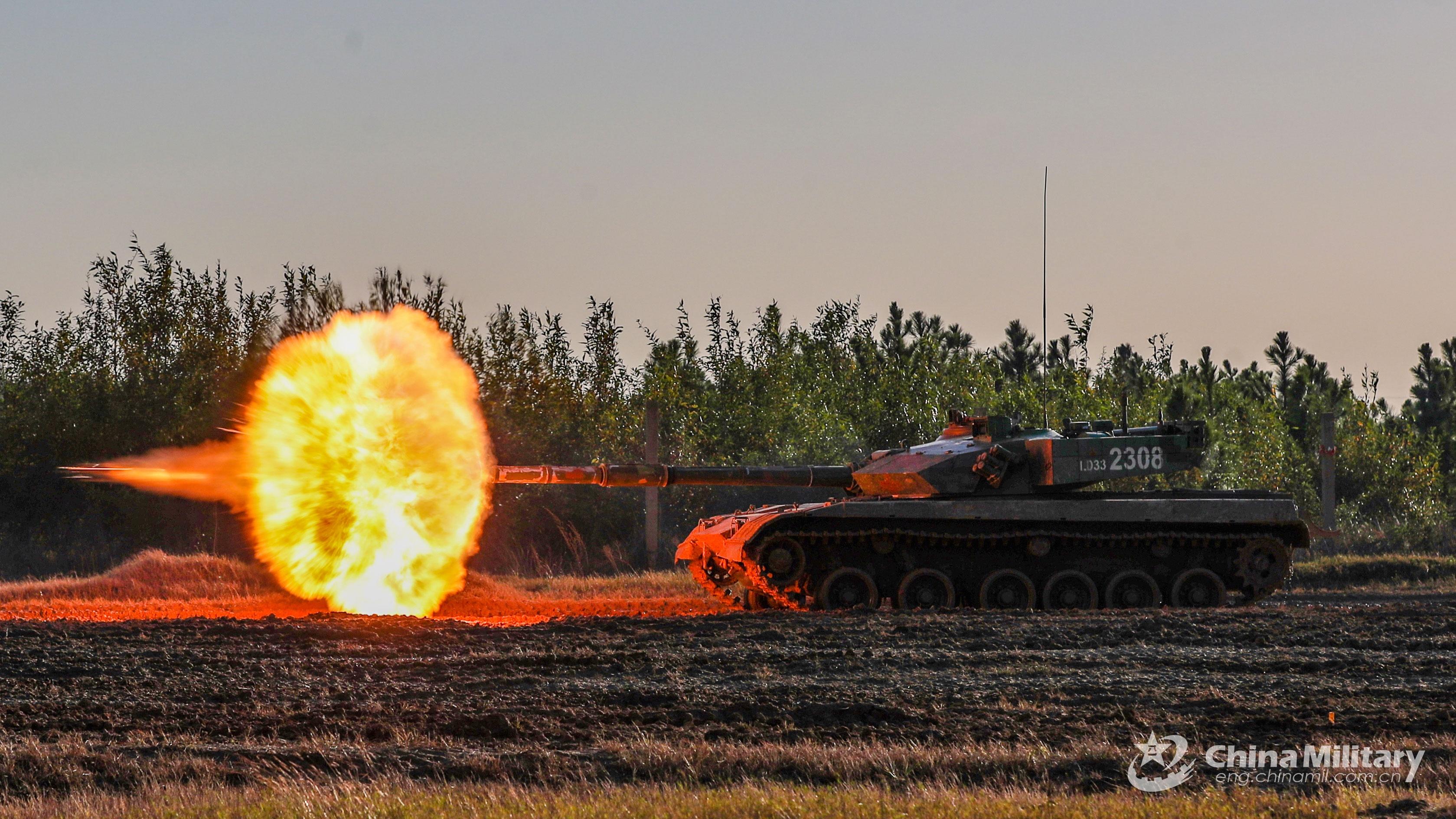 A main battle tank (MBT) attached to a combined arms brigade under the PLA 72nd Group Army spits fire down range at mock ground target during a live-fire training exercise on November 8, 2021. (eng.chinamil.com.cn/Photo by Zhang Wenju)