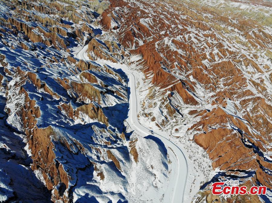Photo taken on Nov. 29, 2021 shows the Danxia National Geological Park after snowfall, Zhangye City, northwest China's Gansu Province. (Photo: China News Service/Zhang Yanmin)