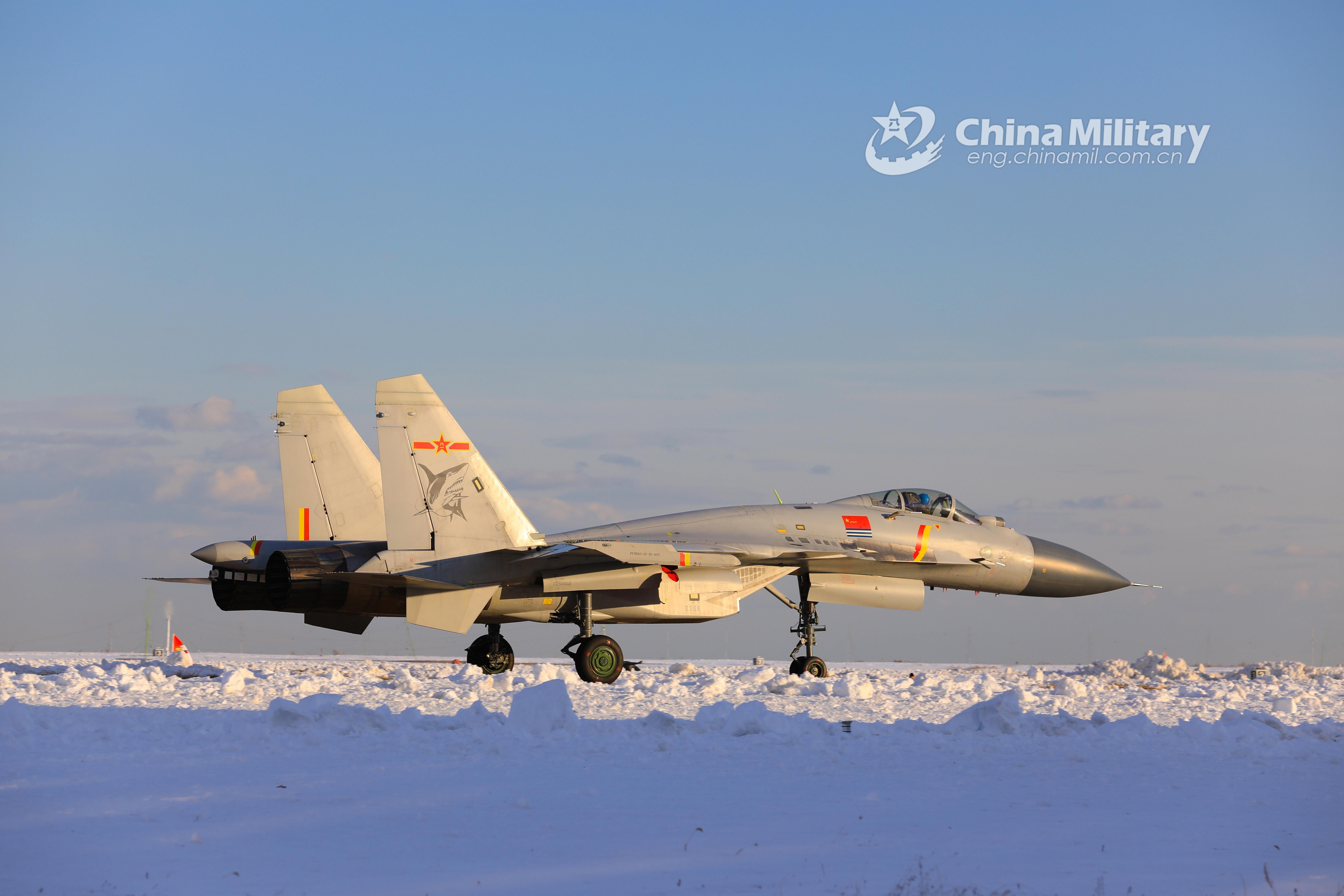 A pilot cadet assigned to the PLA Naval Aviation University guides his fighter jet on the snow-covered runway and prepares to take off for a flight training course on November 9, 2021. (eng.chinamil.com.cn/Photo by Jiang Tao)