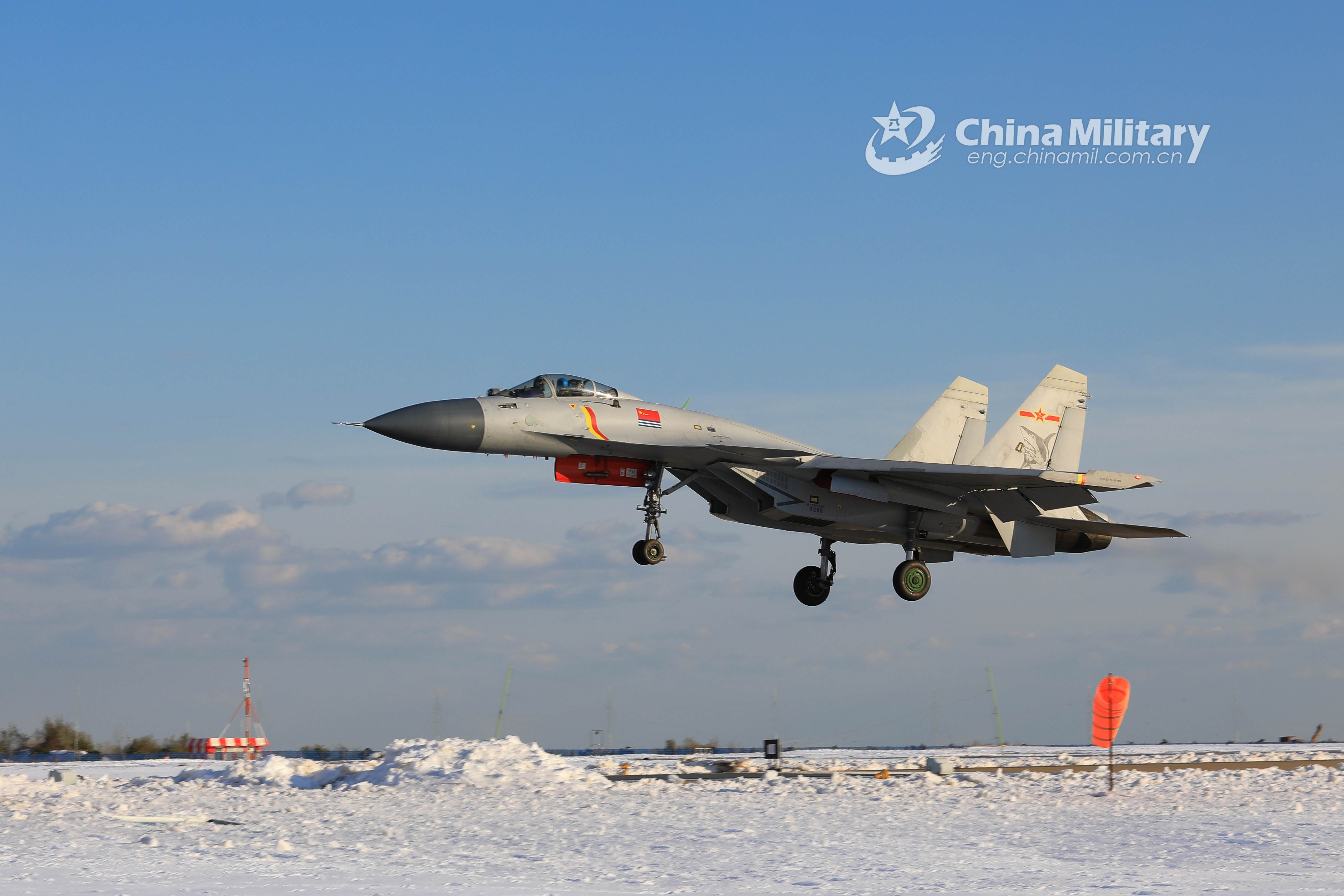 A pilot cadet assigned to the PLA Naval Aviation University guides his fighter jet on the snow-covered runway and prepares to take off for a flight training course on November 9, 2021. (eng.chinamil.com.cn/Photo by Jiang Tao)