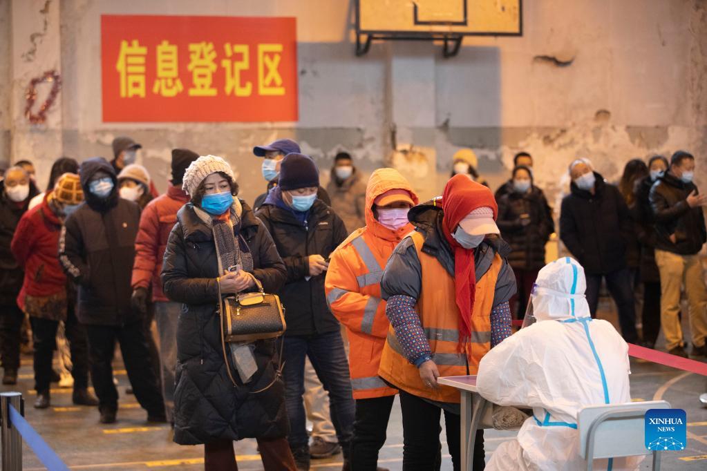 Residents line up to register information for nucleic acid testing at a sampling site in Xiangfang District of Harbin City, northeast China's Heilongjiang Province, Dec. 2, 2021. Harbin launched the first round of all-inclusive nucleic acid testing in some areas on Thursday since new locally transmitted confirmed COVID-19 cases were reported. (Xinhua/Zhang Tao)